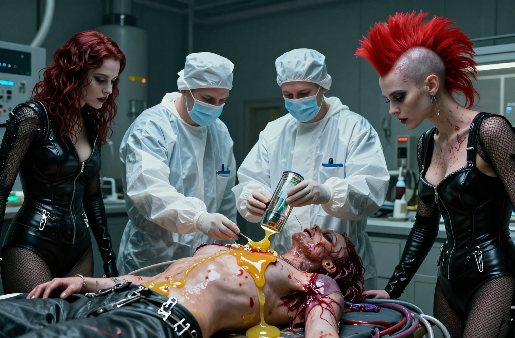 Work inside a crashed biomechanical Leviathan. Hybrid surgeon-scavenger outfits, scarred tissue, and viscous fluids create a brutal, clinical scene of intimate,…