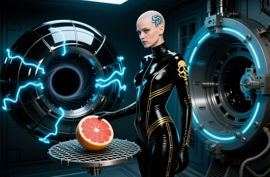 A young woman hovers in a biomechanical cave, holding a delicate test tube. Translucent silk wrap skirt and glittering tech harness blend with pulsating violet…