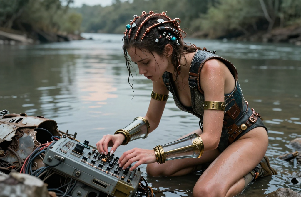 A girl kneels at the bank of a polluted river, shaping alien metal with hammer and chisel. Toxic light reflects on the water. Her worn leotard, leather vest,…