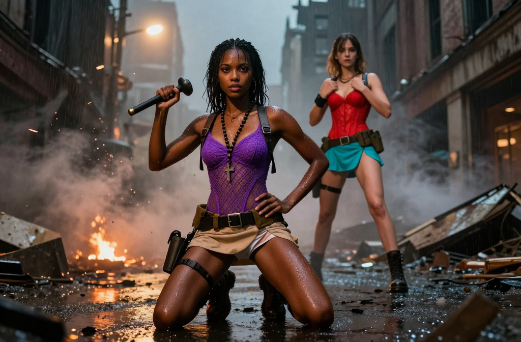 Young black woman kneels in rain-soaked urban ruins at night, holding a tonfa with a confident stance. Wet streets reflect dim light as debris and sparks move…
