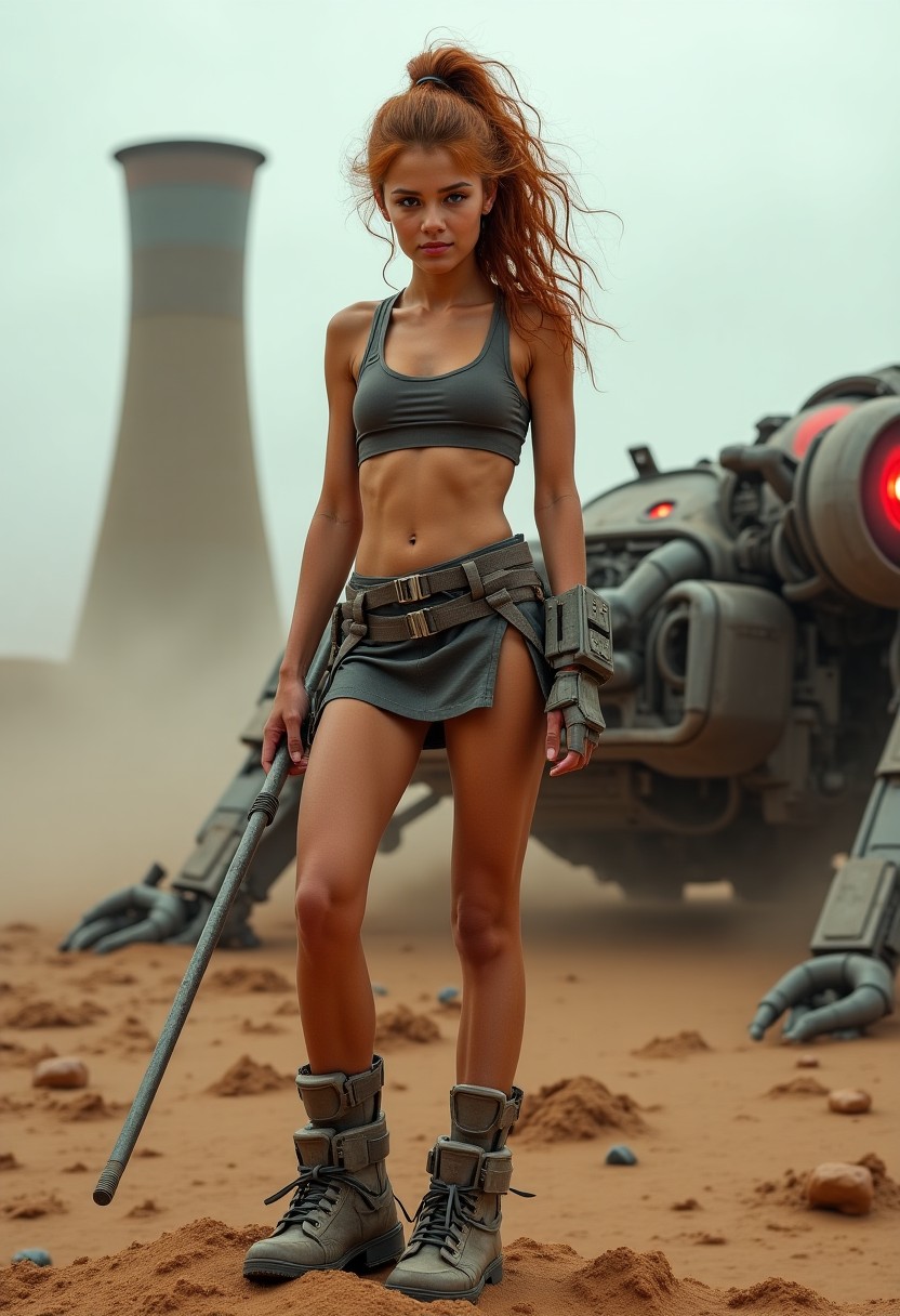 Young barefoot woman kneels in a vast post-apocalyptic desert, holding a spiral rod. Golden dust shimmers on her skin as she stares into the distance. Behind…