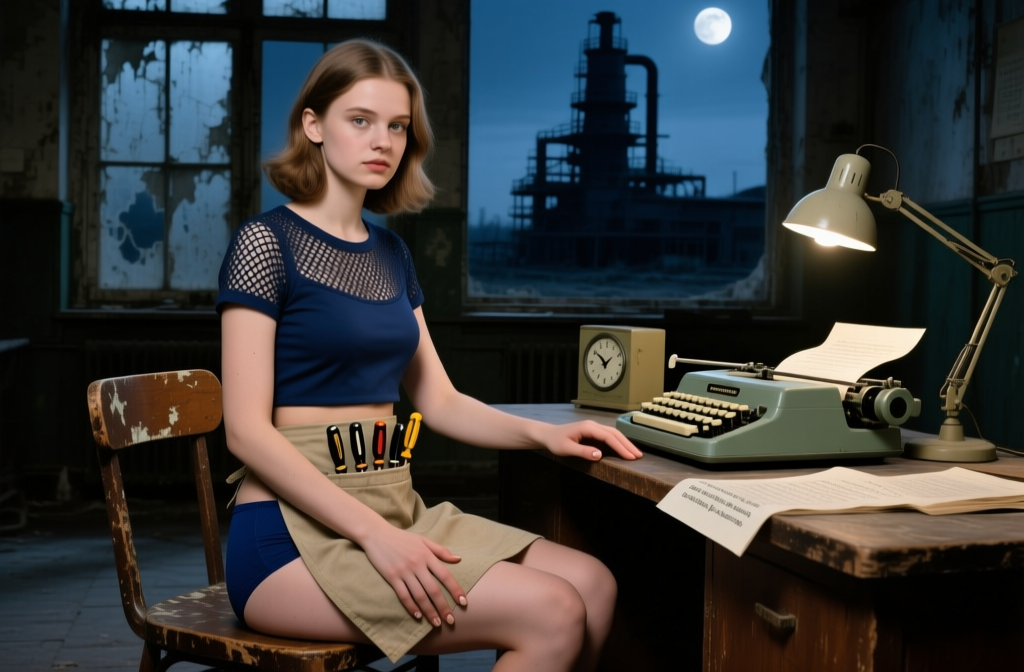 In a dark telegraph hall, a young woman sits on a rotted wooden chair, wearing a navy mesh top, functional canvas apron with screwdrivers, and dark blue…