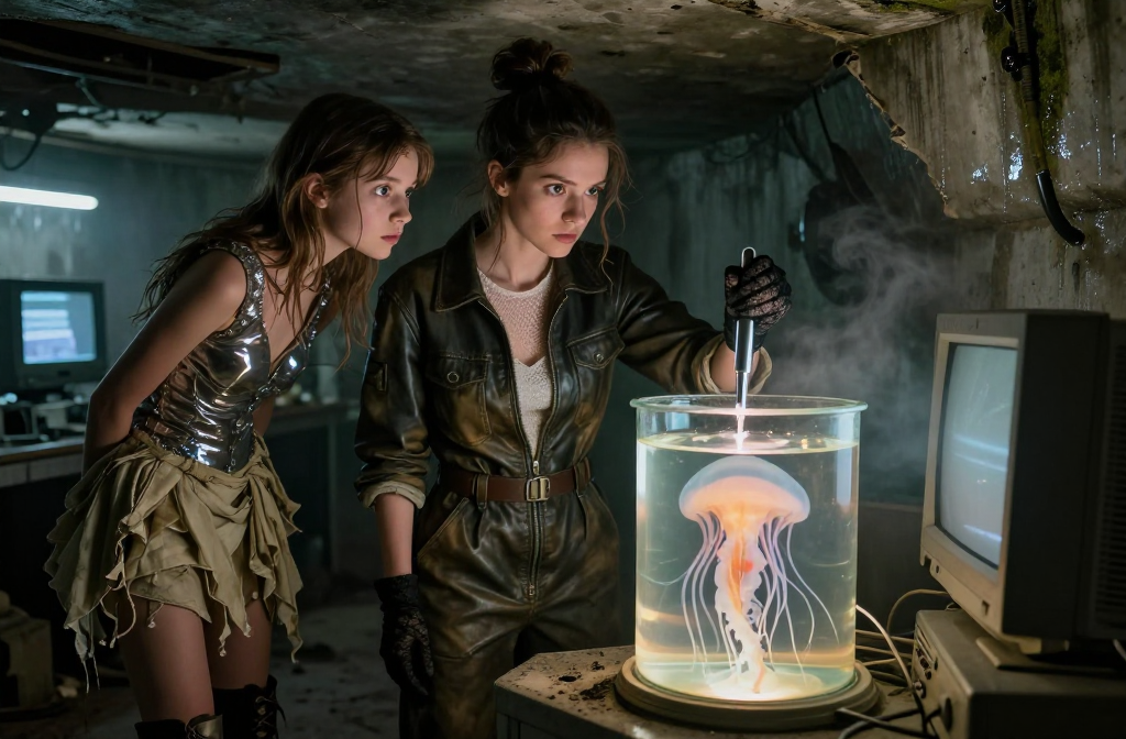 Two young women study a glowing jellyfish-like organism in a damp, moldy bunker lab, with flickering CRT monitors, swirling sulfur mist, and dusty equipment,…