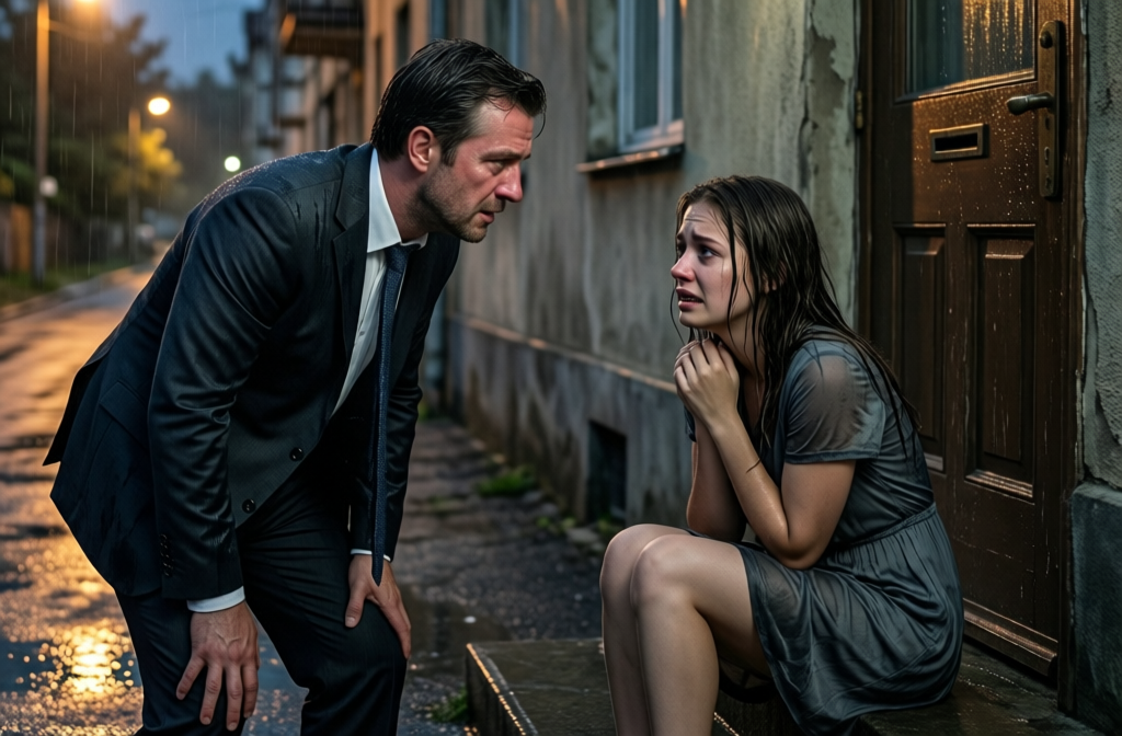 A rain-soaked man wanders a desolate street after betrayal and encounters a fragile young woman fleeing violence. Under flickering streetlights, fear and silent…