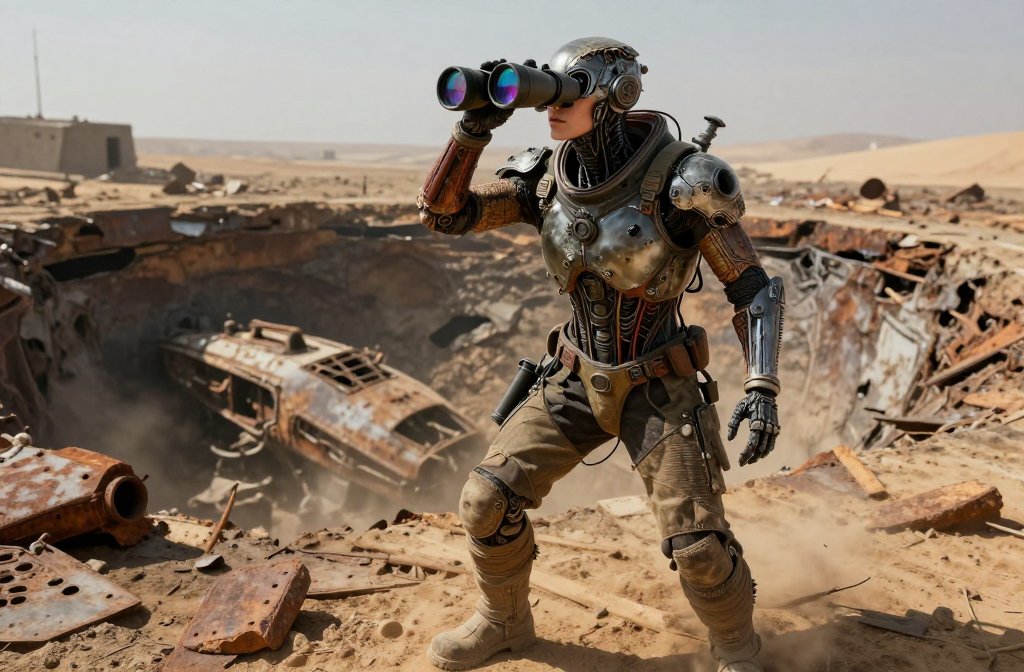 A girl stands beside a rotting watchtower at sunset, resting a hand on a rusted telescope stand. Leather bloomers, striped top, ammo belt, and backpack form a…