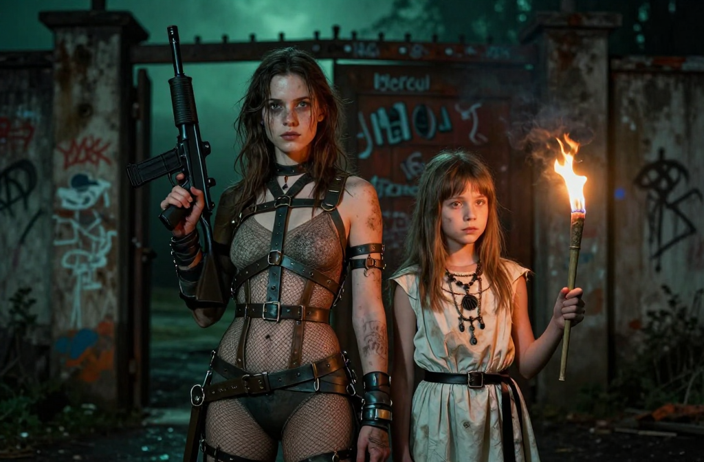 A young woman in heavy metal armor holds a rifle, a girl in a tattered dress holds a burning torch. Dusty, worn outfits, standing back-to-back before a rusted…