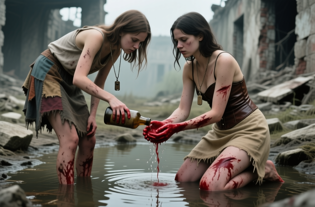 In a ruined courtyard, a girl gently pours water over the blood-stained hands of a wounded woman kneeling by a polluted pool. The quiet, almost sacred act of…