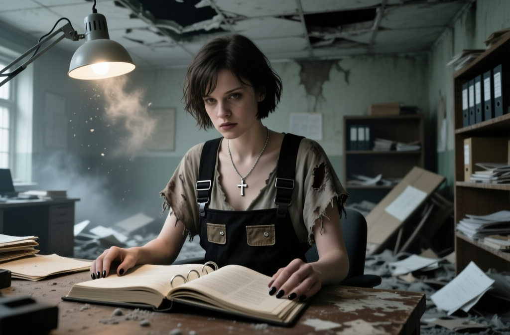 In a dark, destroyed office, a lone clerk sits at a rotting desk, reading an open file by the light of a single lamp. Dust and ash fall from the ceiling as a…