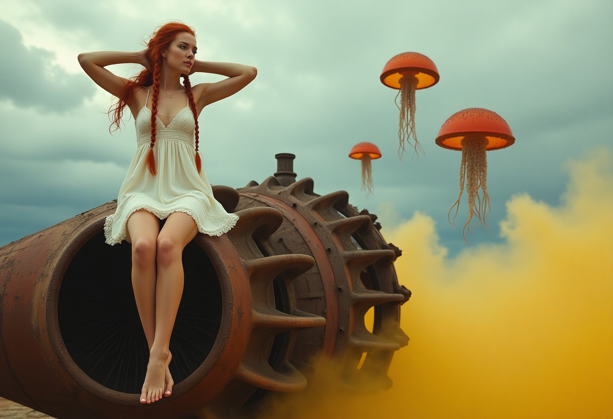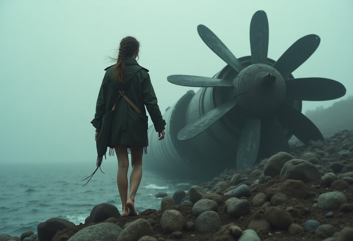 Amid sulfurous mists and drifting jellyfish, a lone woman perches on jet wreckage, white dress fluttering. Humanity’s last guardians, women watch mutations,…