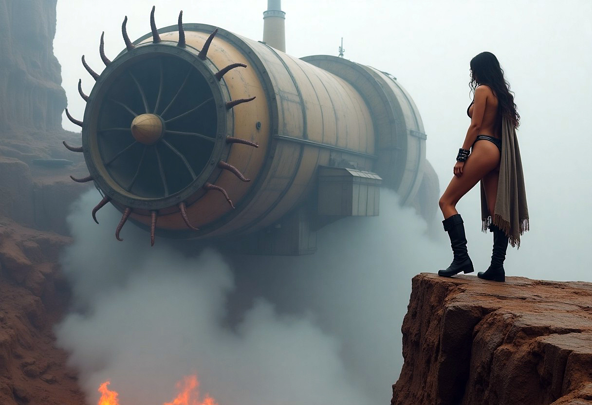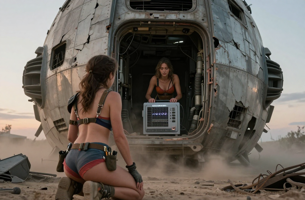 At dusk in a ruined landscape with drifting dust, a massive corroded spaceship looms. A young woman stands in the open hatch holding an energy box, wearing a…