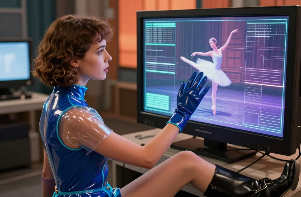 Young woman in a decayed, empty TV studio wearing a dark blue transparent PVC leotard with cyan accents. She sits before a screen showing a ballerina, one boot…