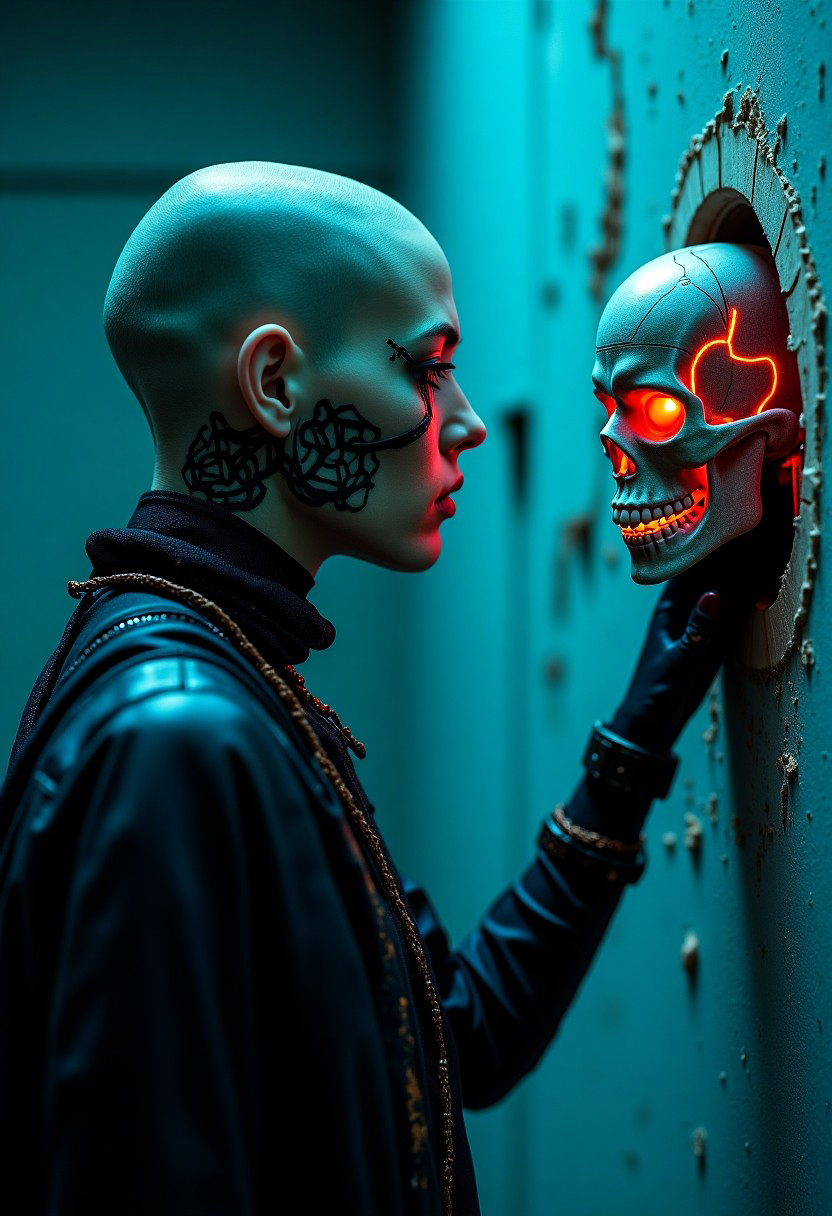Her hand rests upon the skull’s jaw—where neon veins pulse with secrets. In the decaying silence of the corridor,…