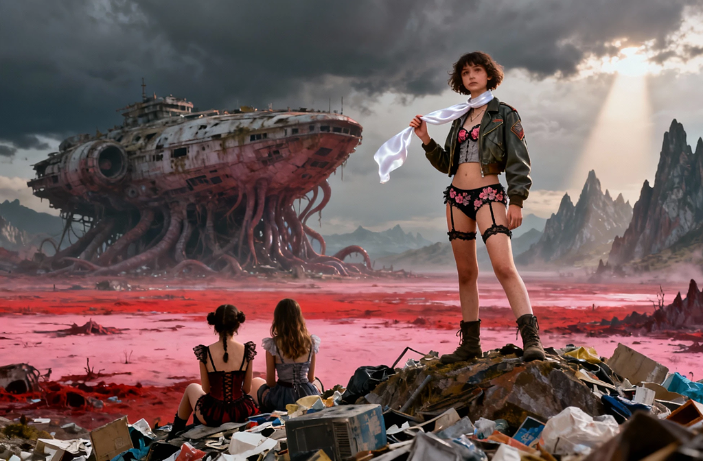 A small group of survivors stands atop a mound of discarded civilization. In front, a navigator grips a white silk scarf, facing a dead plain glowing in red and…