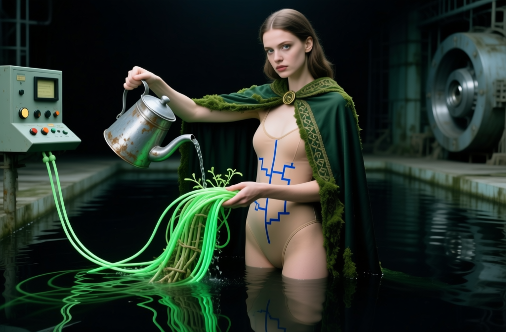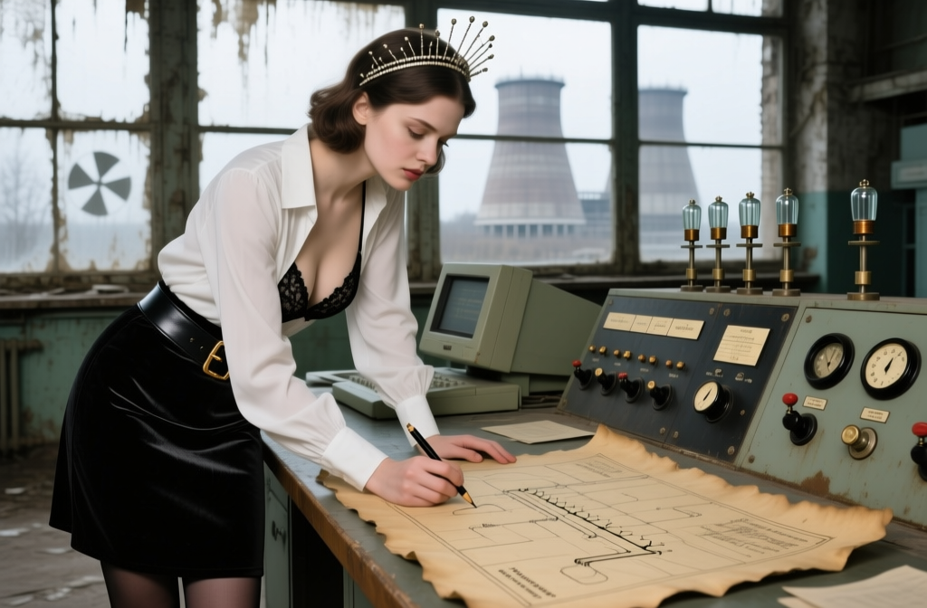 In a dark telegraph hall, a young woman sits on a rotted wooden chair, wearing a navy mesh top, functional canvas apron with screwdrivers, and dark blue…