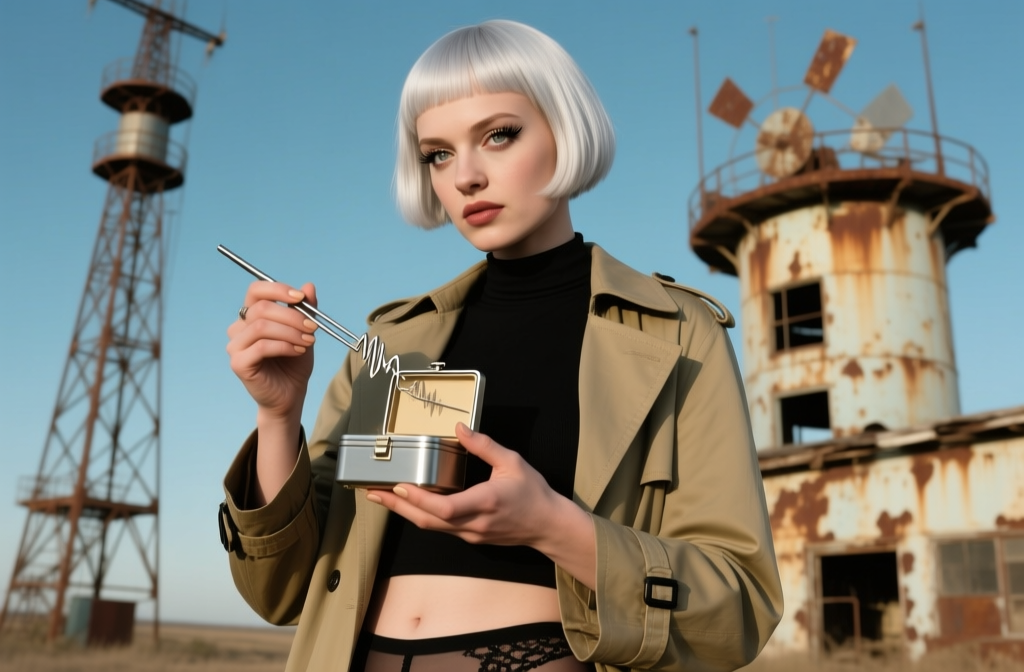 A young woman with platinum short hair stands before a derelict radio station in the Midwest USA. Wearing a khaki trench coat over black cotton top and…