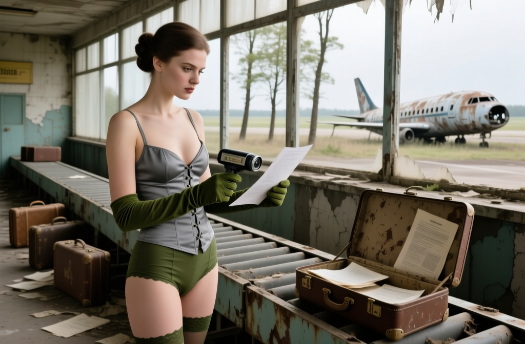 A young woman with a strict bun stands before a rotted conveyor belt in an abandoned baggage terminal. Wearing a gray parachute silk corset, olive bloomers and…