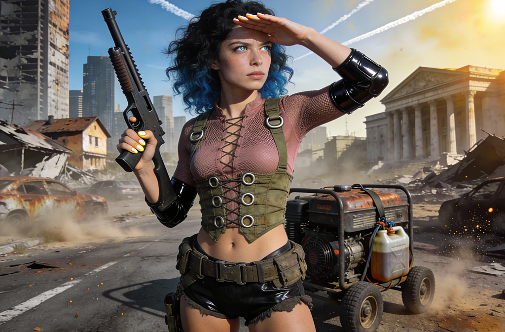A young woman with black-blue curly hair stands alert in a post-apocalyptic city, wearing dusty-rose tech-mesh blouse, black waxed-canvas bloomers, and…