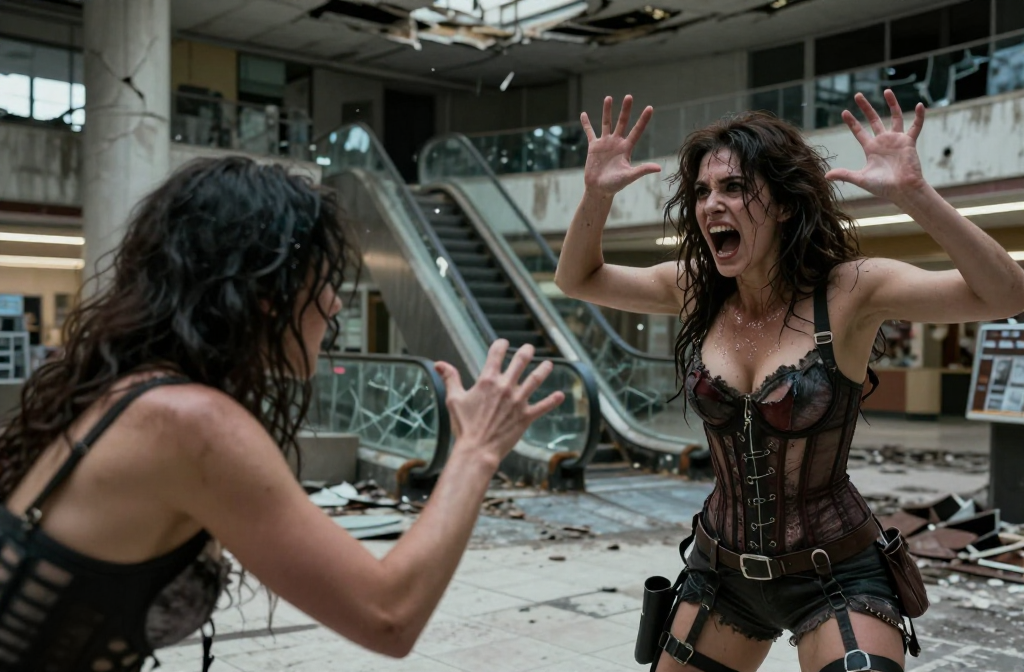 Two women struggle violently inside a dark, abandoned department store. Collapsed ceilings, broken tiles, shattered glass, and deep shadows surround them as…