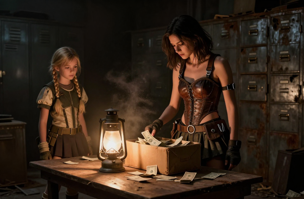 Young woman stands at a wooden table lit by a single petroleum lamp, examining a worn box filled with loose dollar bills. Dust glows in the warm light while…