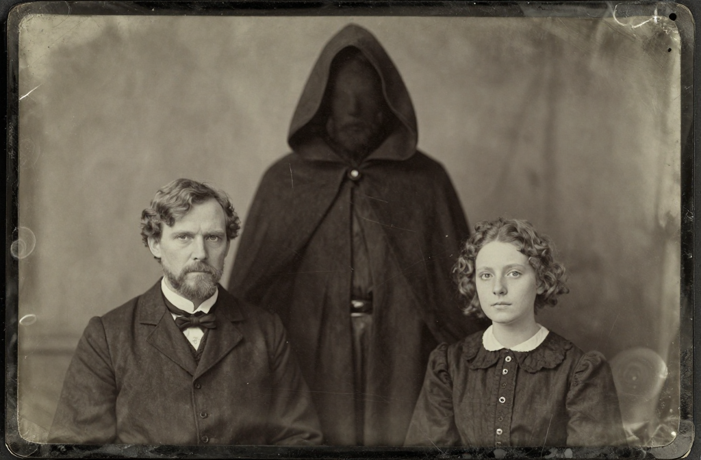 The photograph does not capture a fixed moment, but resembles an unstable document undermining its own reliability. What appears as a familial arrangement…