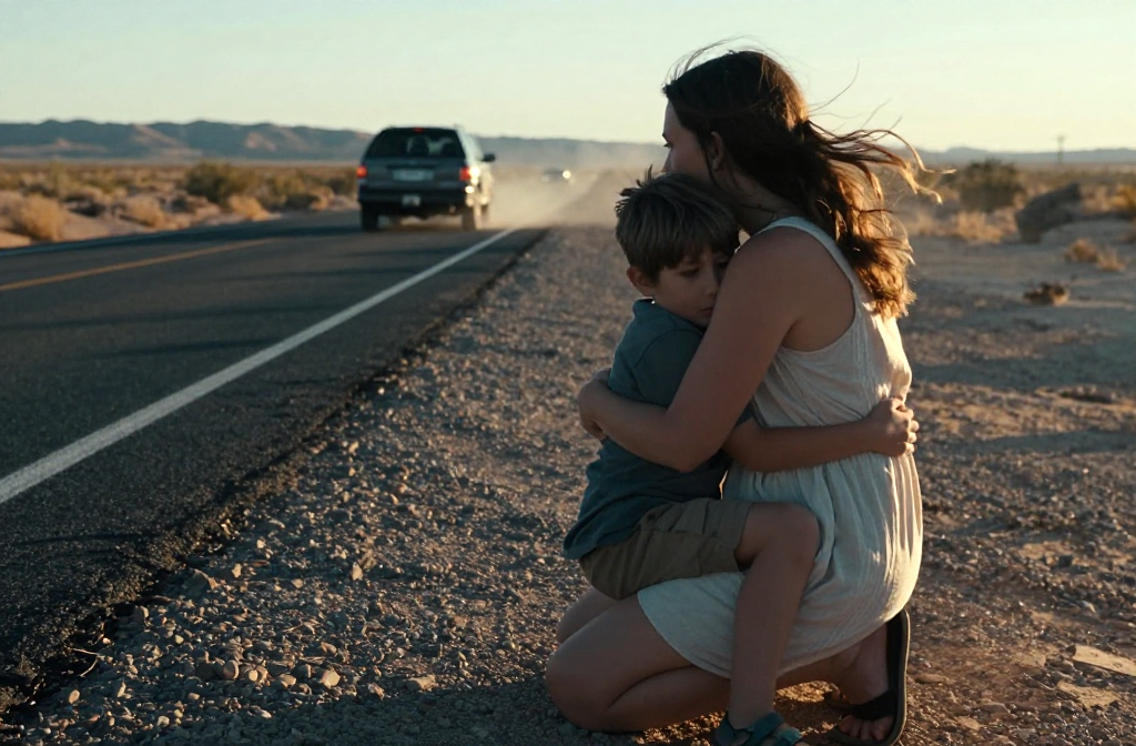 The car vanishes into dust and silence. She crouches, holding the boy tight. No screams, only trembling breath. No one comes. They rise, walk on, past dust and…