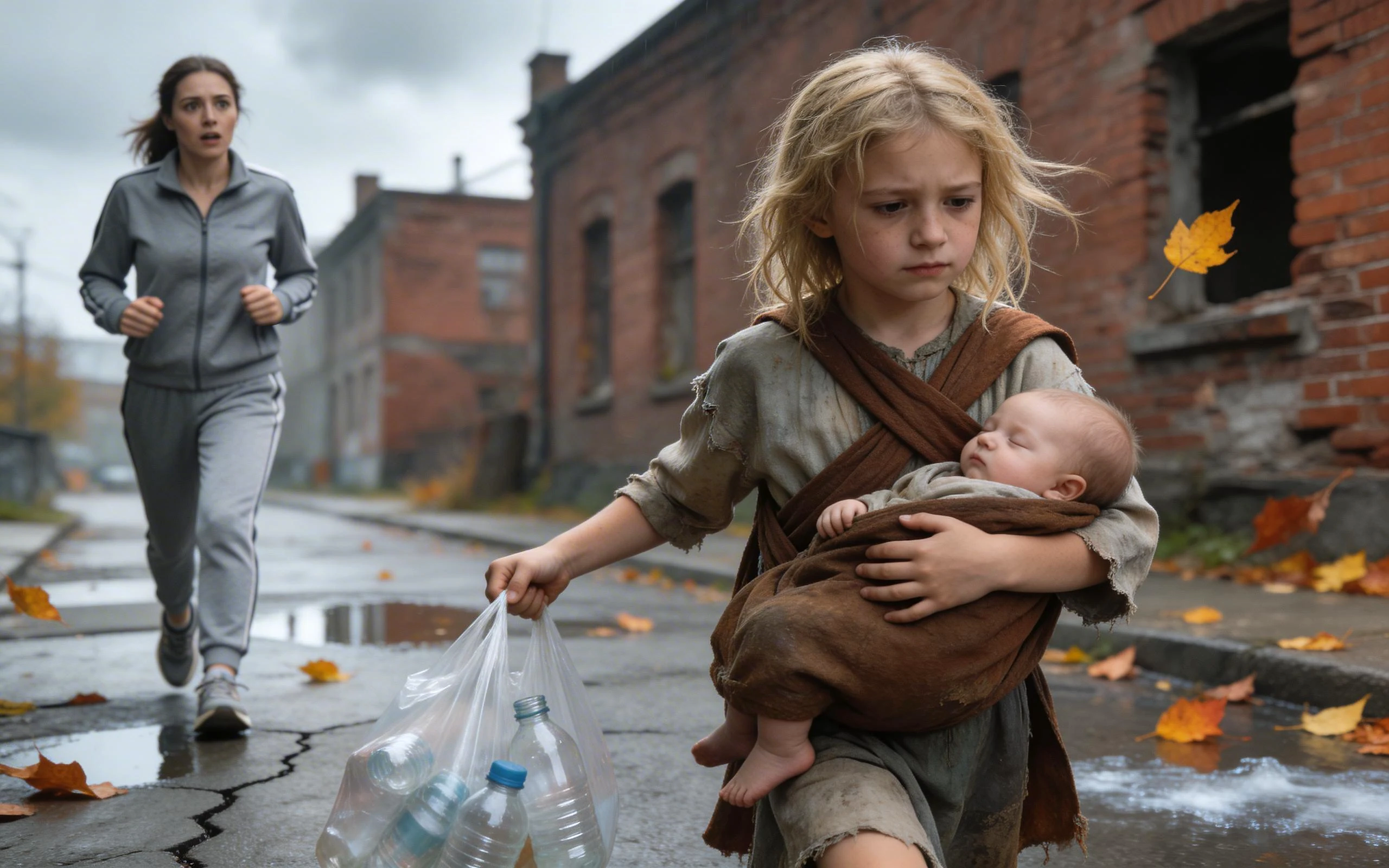 On a cold autumn morning, a jogger stops as she sees a barefoot child carrying a baby through silent streets. In that fragile moment, a simple question becomes…