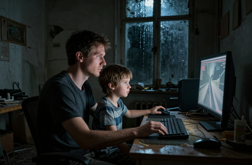 A man and his young son sit in a cluttered, dark room, lit only by a monitor. A broken life unfolds in silence after loss, unemployment, and abandonment, where…
