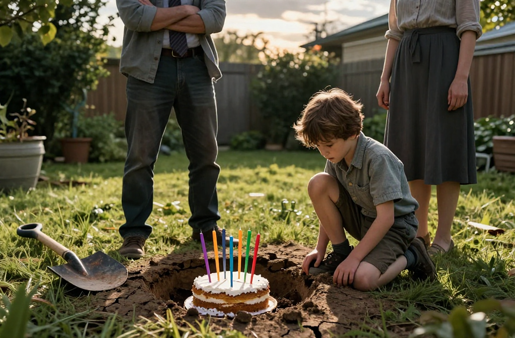 In a quiet garden, a boy buries his cake, facing fear and his father’s control.